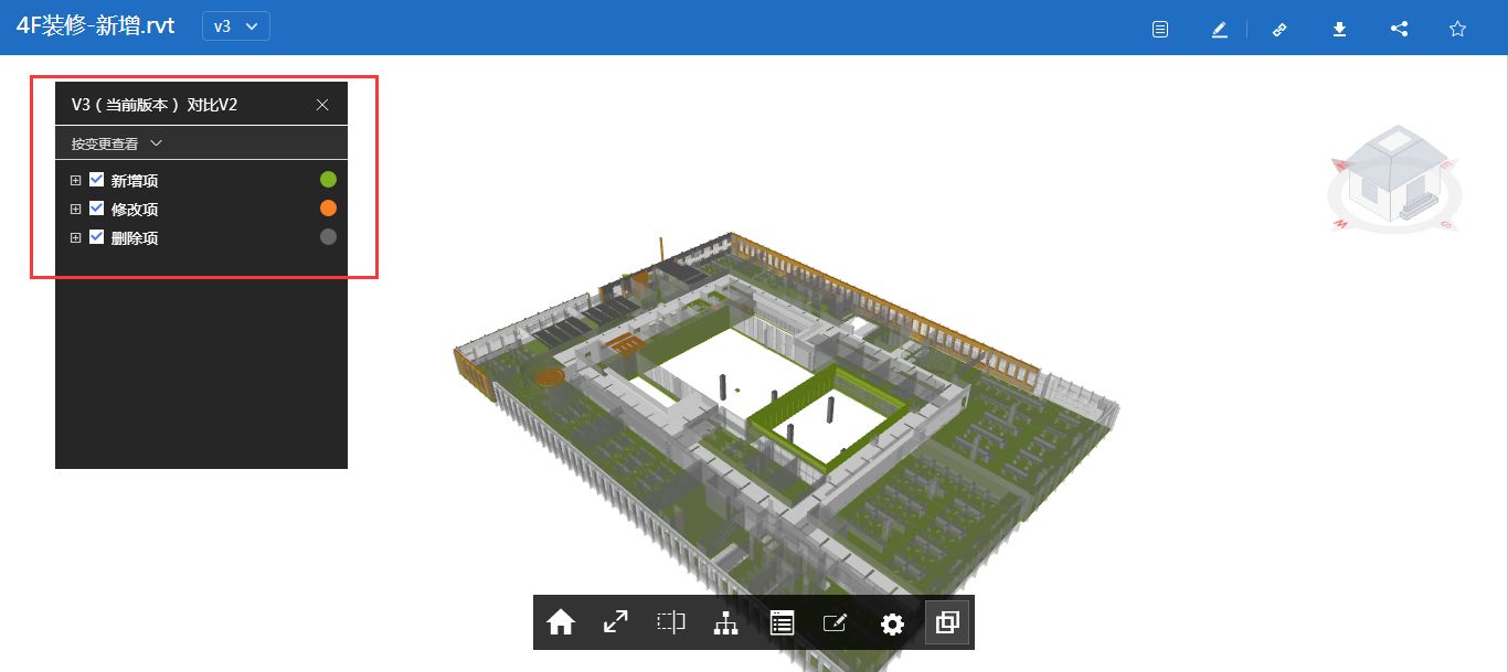 摘要:协筑新增加模型比对功能,可以对两个版本的模型进行比较,并通过颜色区分显示新增加,修改,删除的模型构件,变更内容一目了然,可极大提高模型检查的效率和准确性。